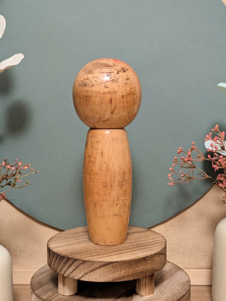 Cette Kokeshi a probablement été réalisée dans les années 1960–1970, période où Suigai a produit de nombreuses œuvres devenues emblématiques du mouvement Sōsaku. Le bois a pris une belle patine au fil du temps, et l’on peut observer de petites marques d’usure, témoins de son histoire et de son authenticité.