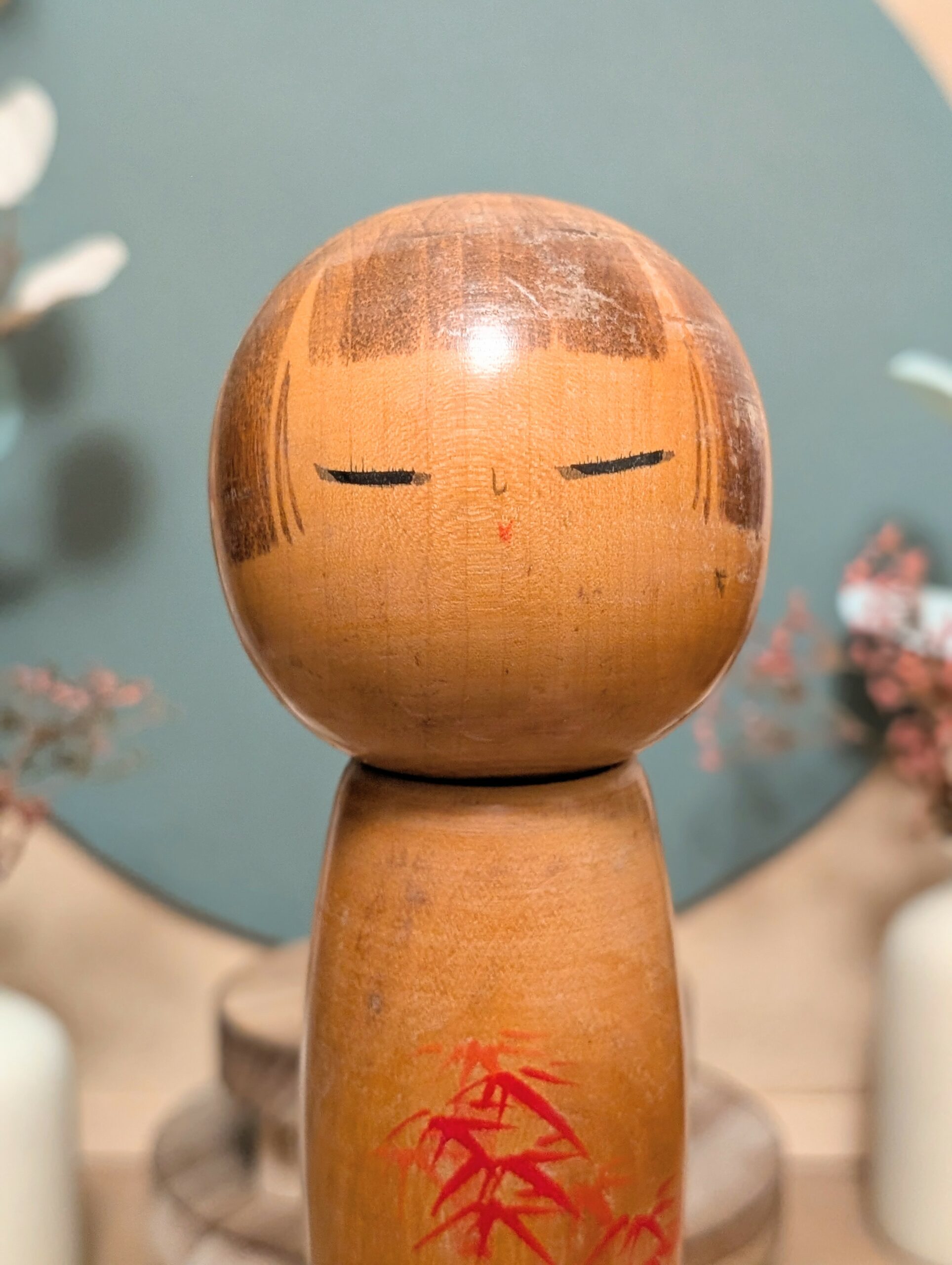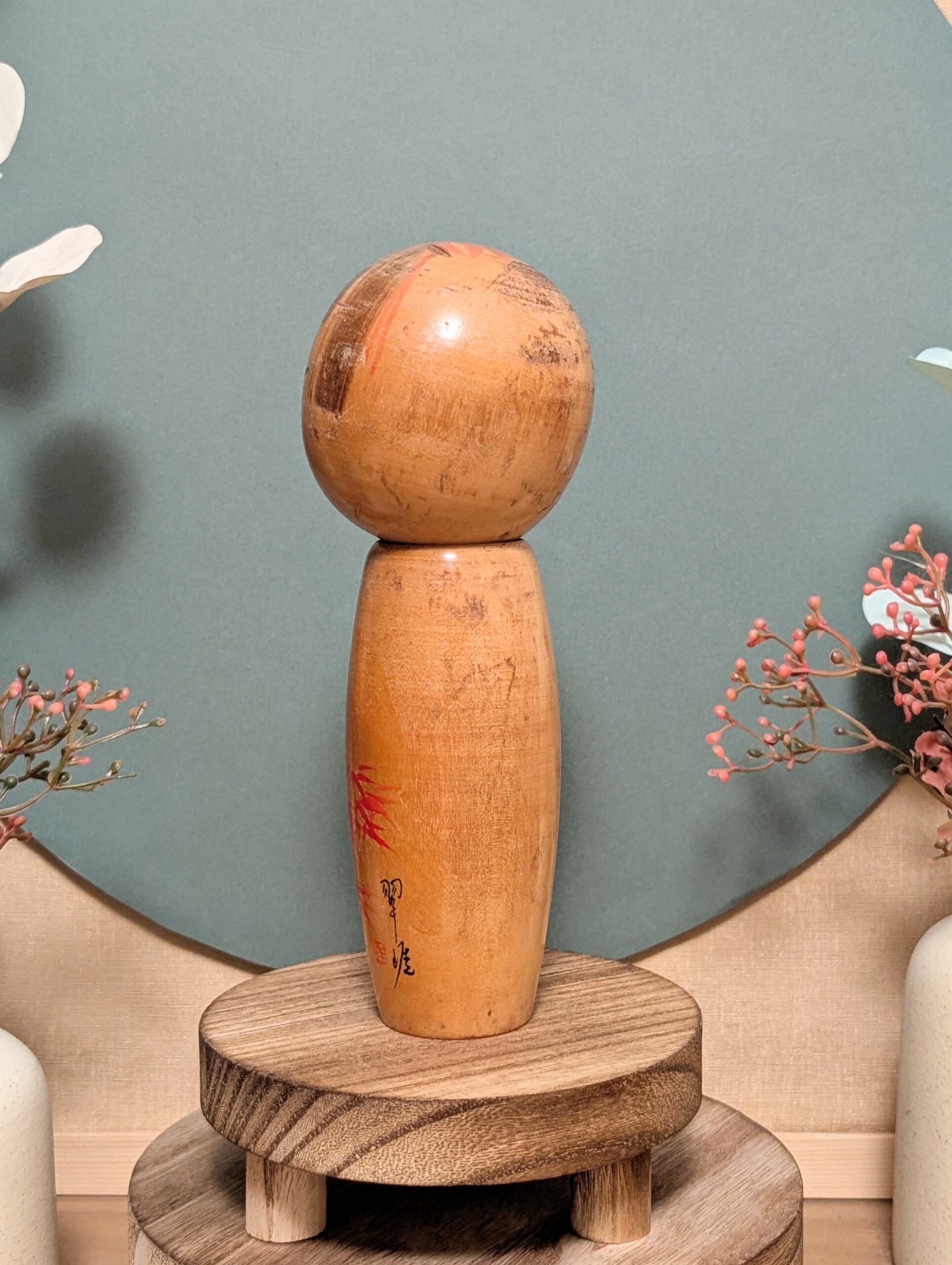 Cette Kokeshi a probablement été réalisée dans les années 1960–1970, période où Suigai a produit de nombreuses œuvres devenues emblématiques du mouvement Sōsaku. Le bois a pris une belle patine au fil du temps, et l’on peut observer de petites marques d’usure, témoins de son histoire et de son authenticité.