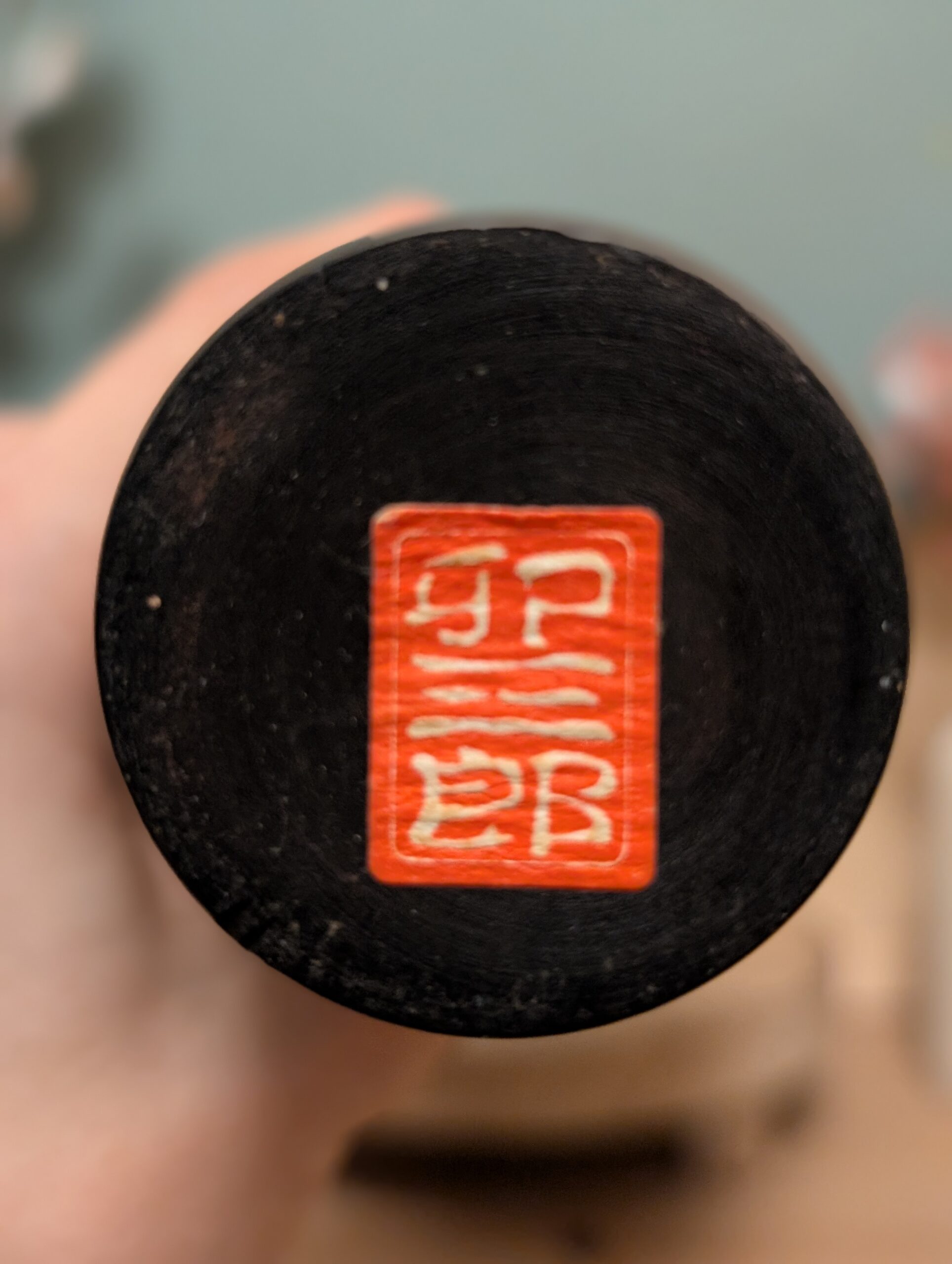 Cette Kokeshi Sōsaku , signée “USABURO”, se distingue par sa silhouette élancée et son bois teinté de sombre qui souligne le veinage du bois.