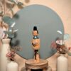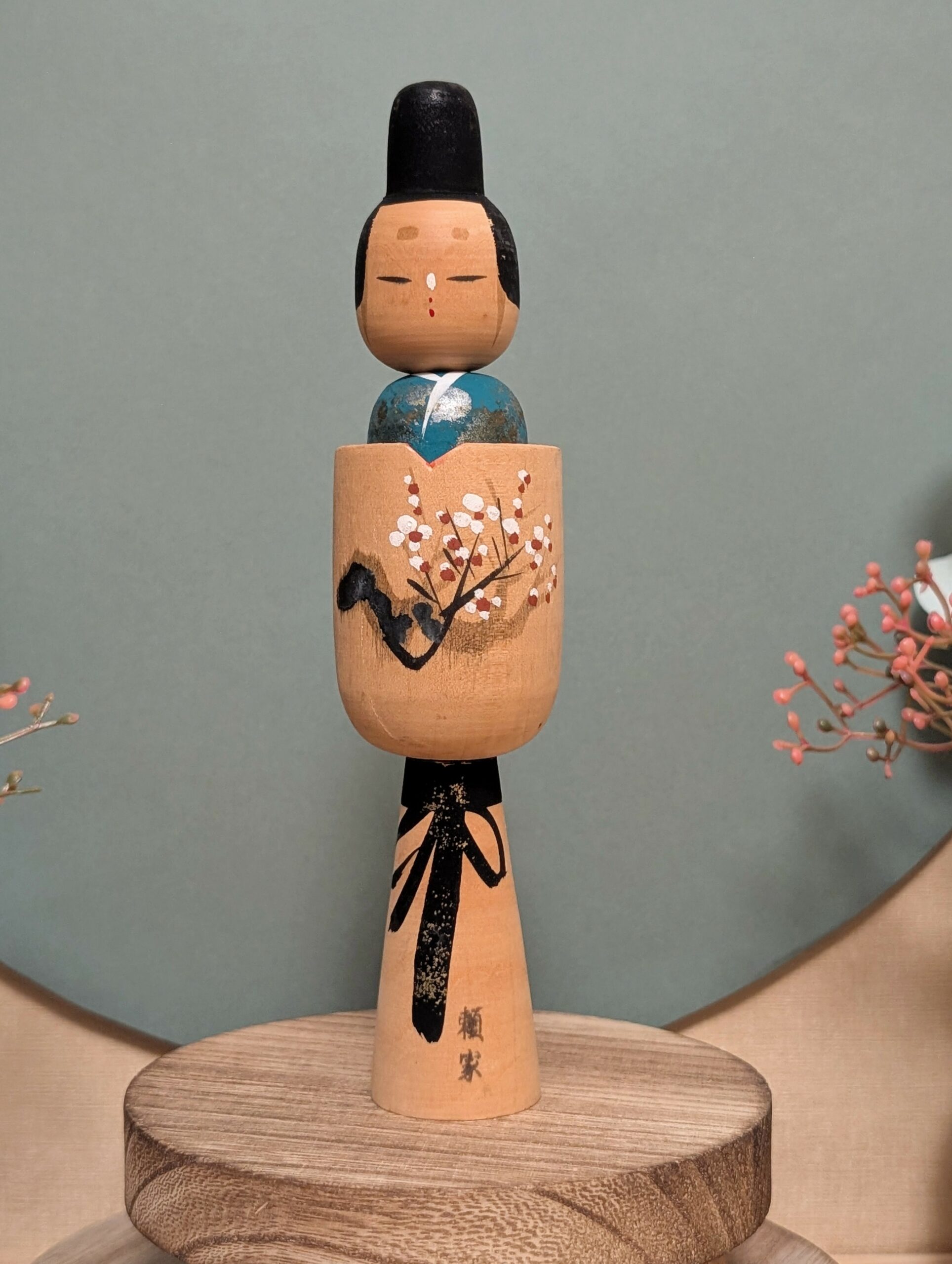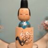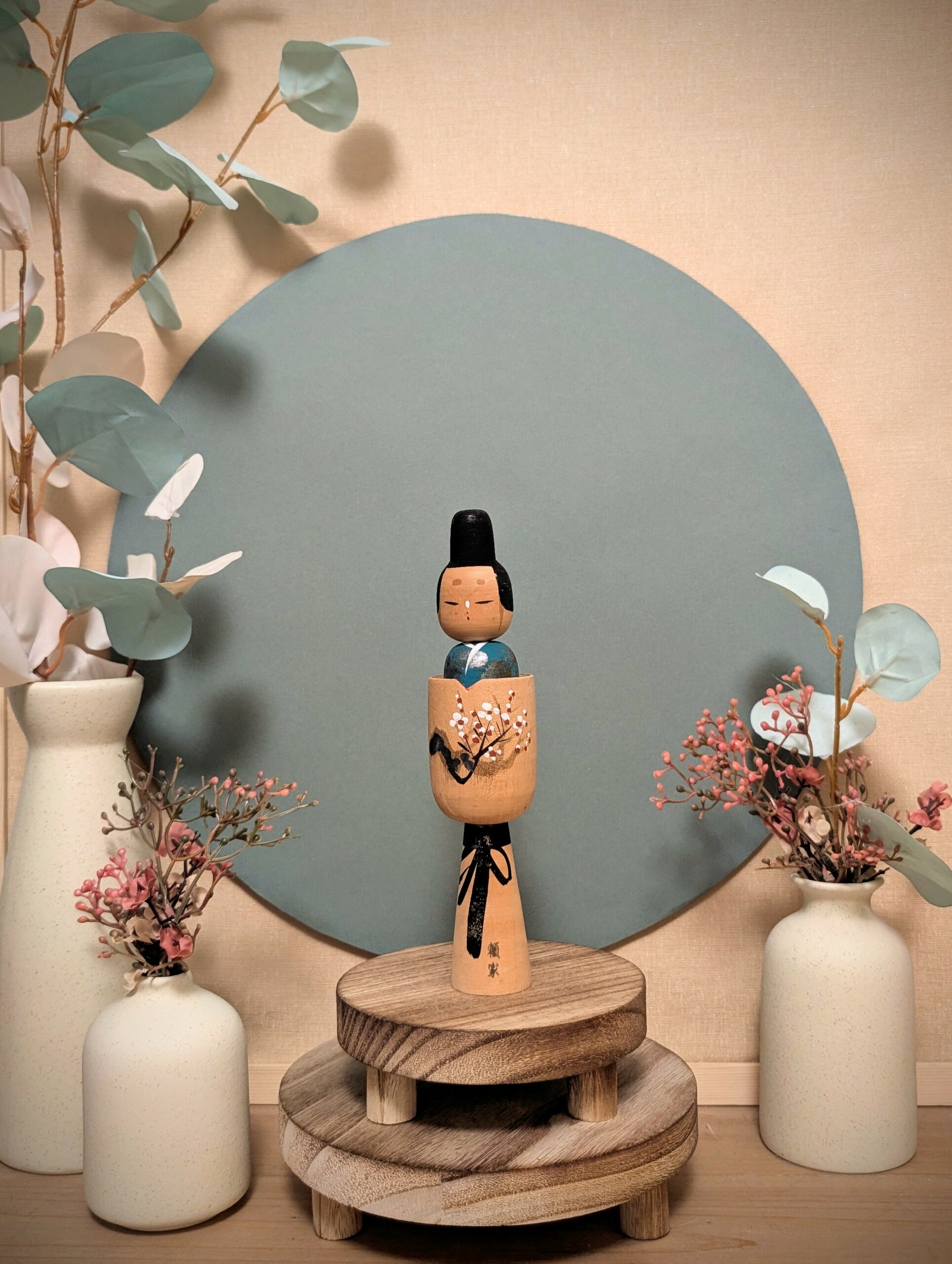 🔹 Cette Kokeshi raffinée représente un noble ou un courtisan japonais (kanjo ou heian noble), reconnaissable à son coiffant noir haut traditionnel (eboshi) et à sa tenue stylisée peinte avec élégance.