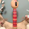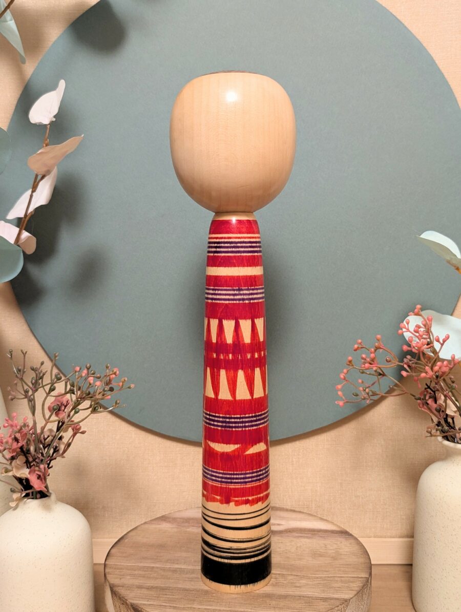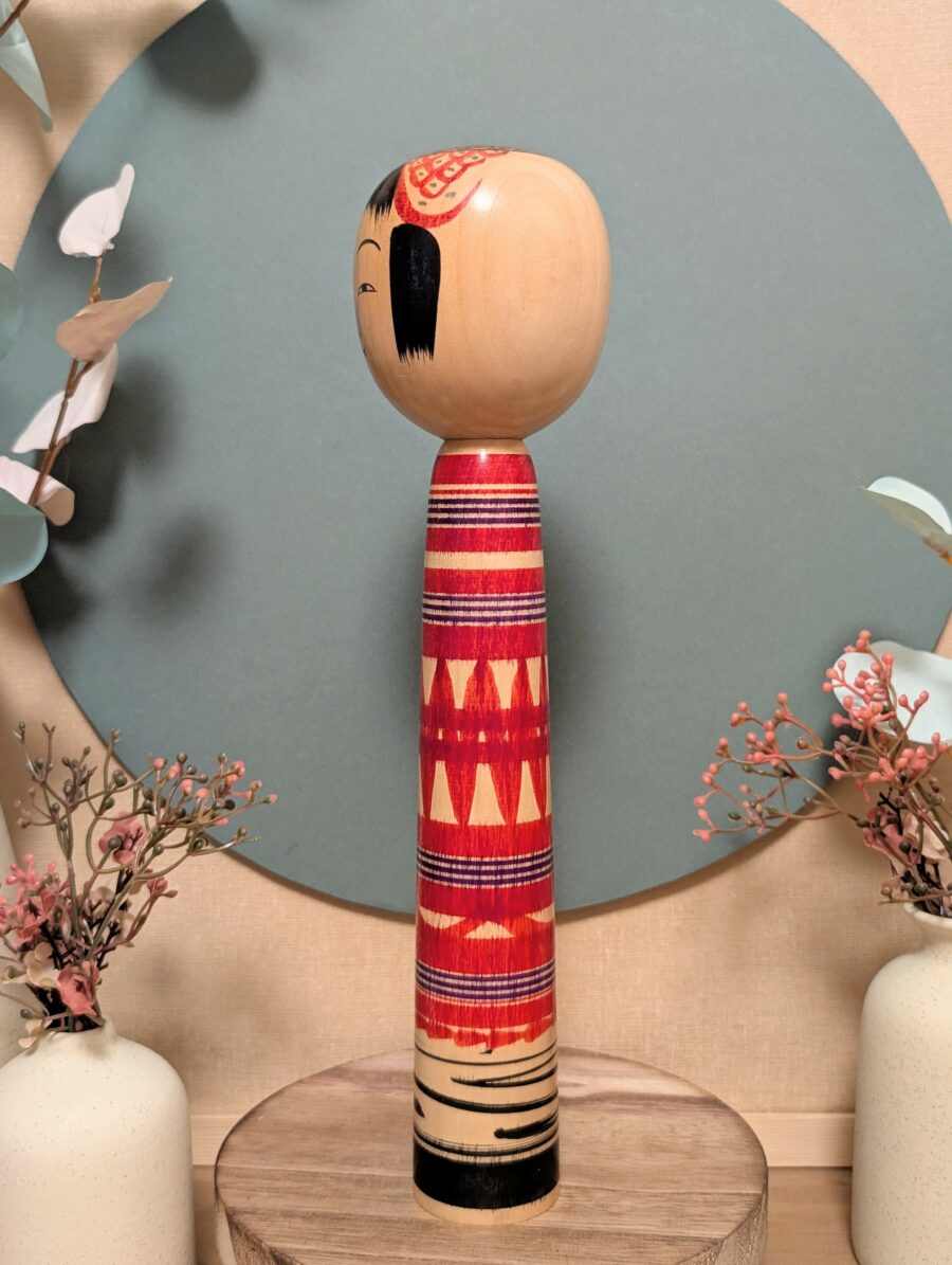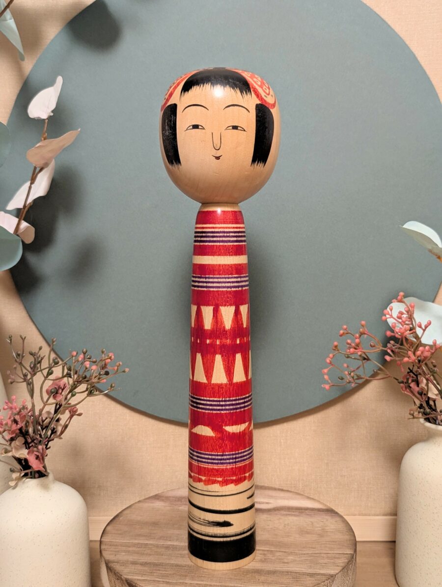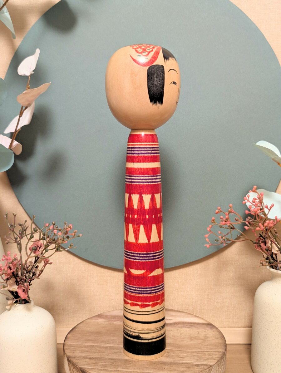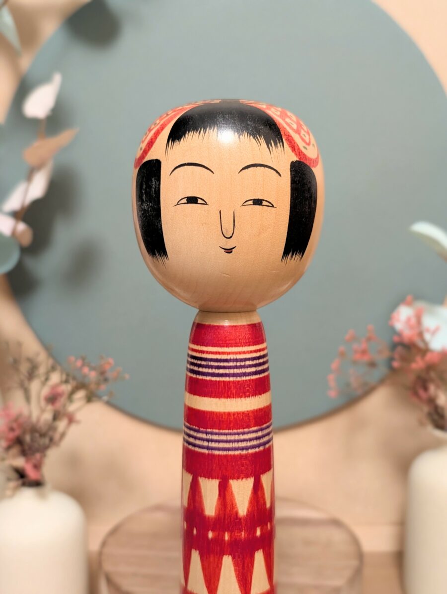 🔹Le motif rouge qui entoure sa tête est un élément traditionnel souvent présent dans les kokeshi Tsuchiyu.