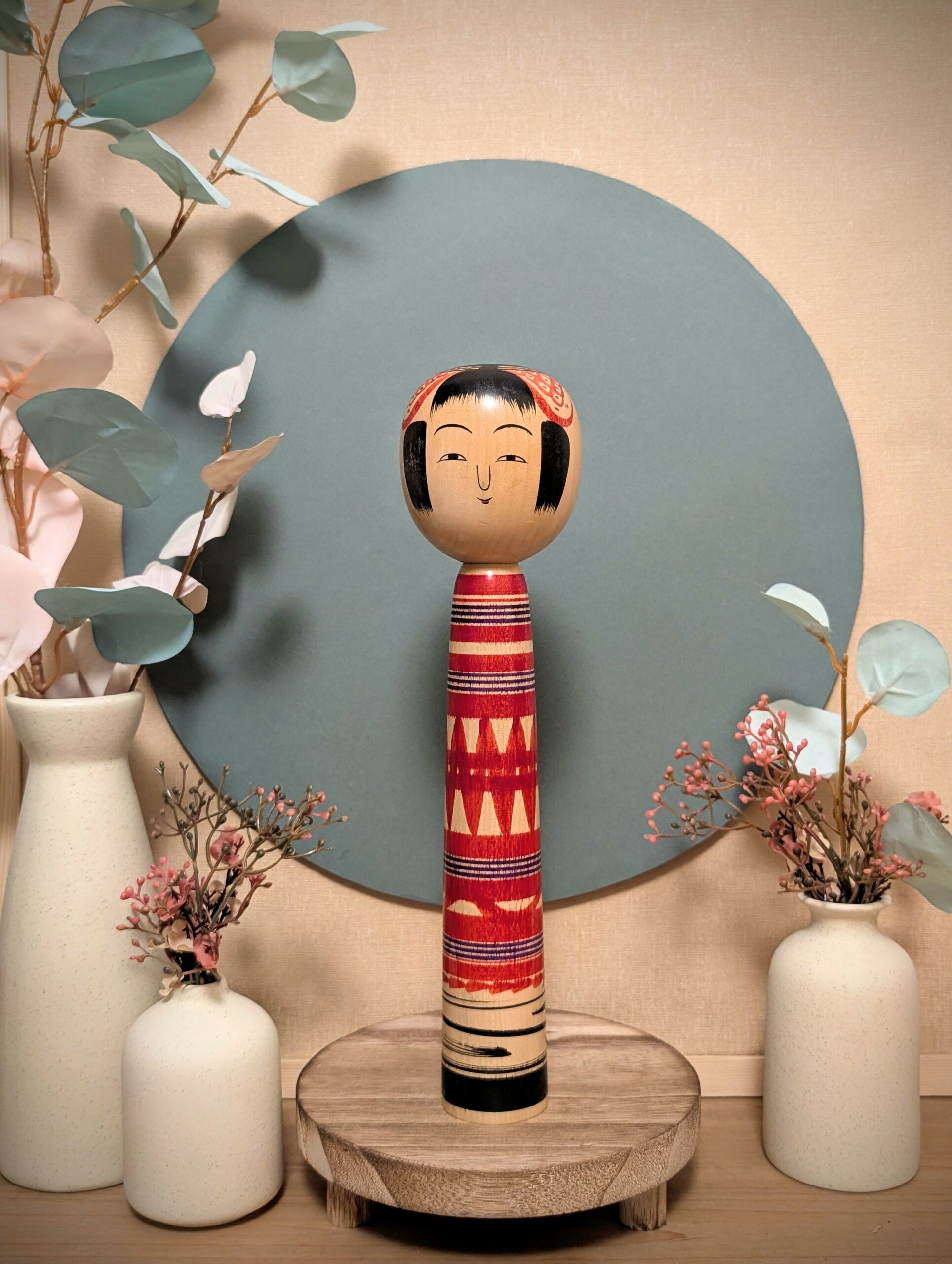 🔹Le motif rouge qui entoure sa tête est un élément traditionnel souvent présent dans les kokeshi Tsuchiyu.