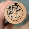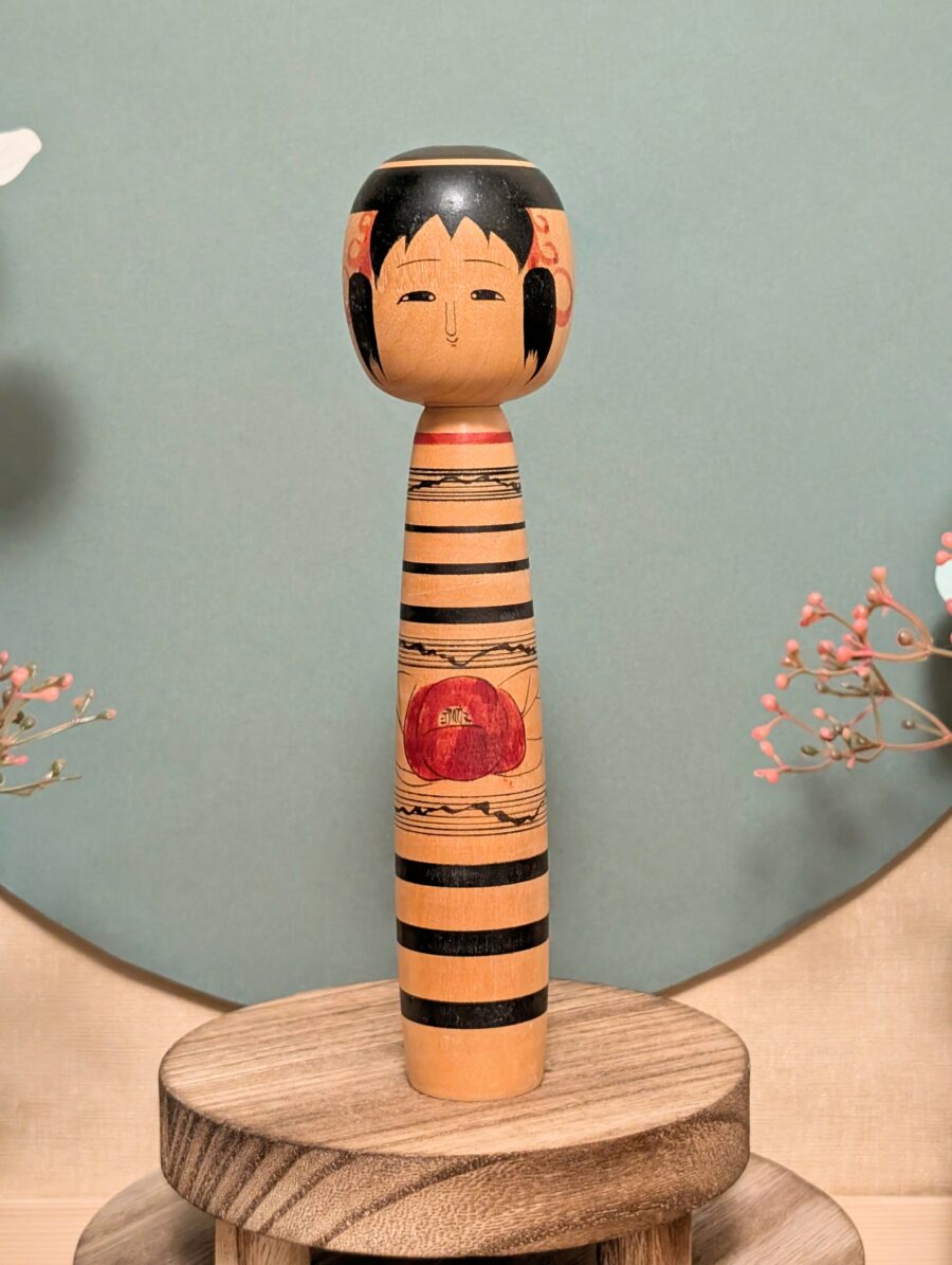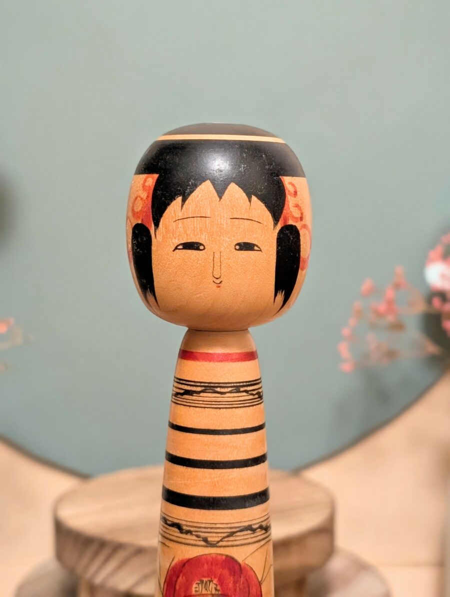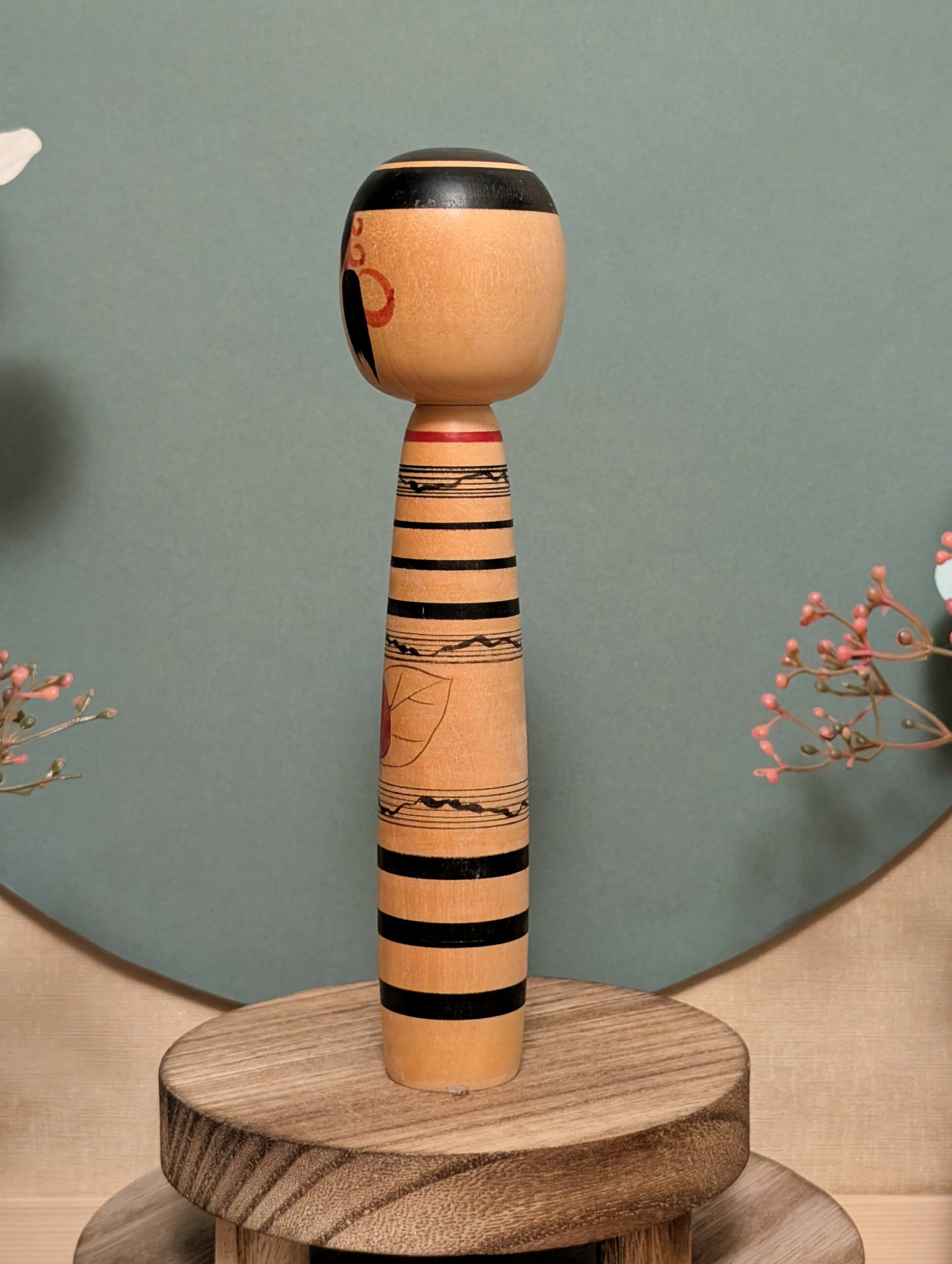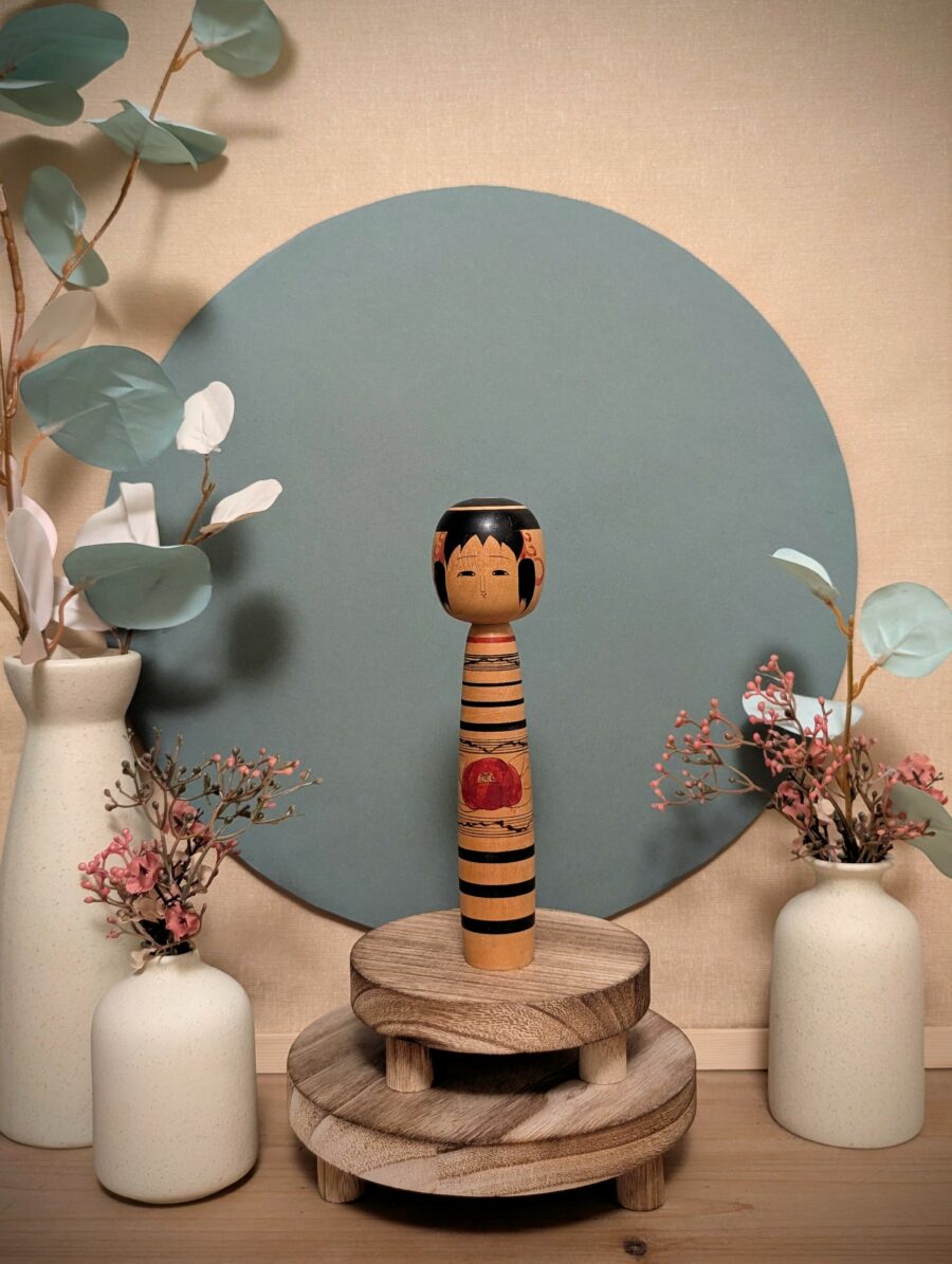 Cette kokeshi illustre parfaitement l’équilibre propre aux créations Tsuchiyu : une alliance de rigueur géométrique avec les anneaux noirs, et de vitalité grâce au motif floral coloré