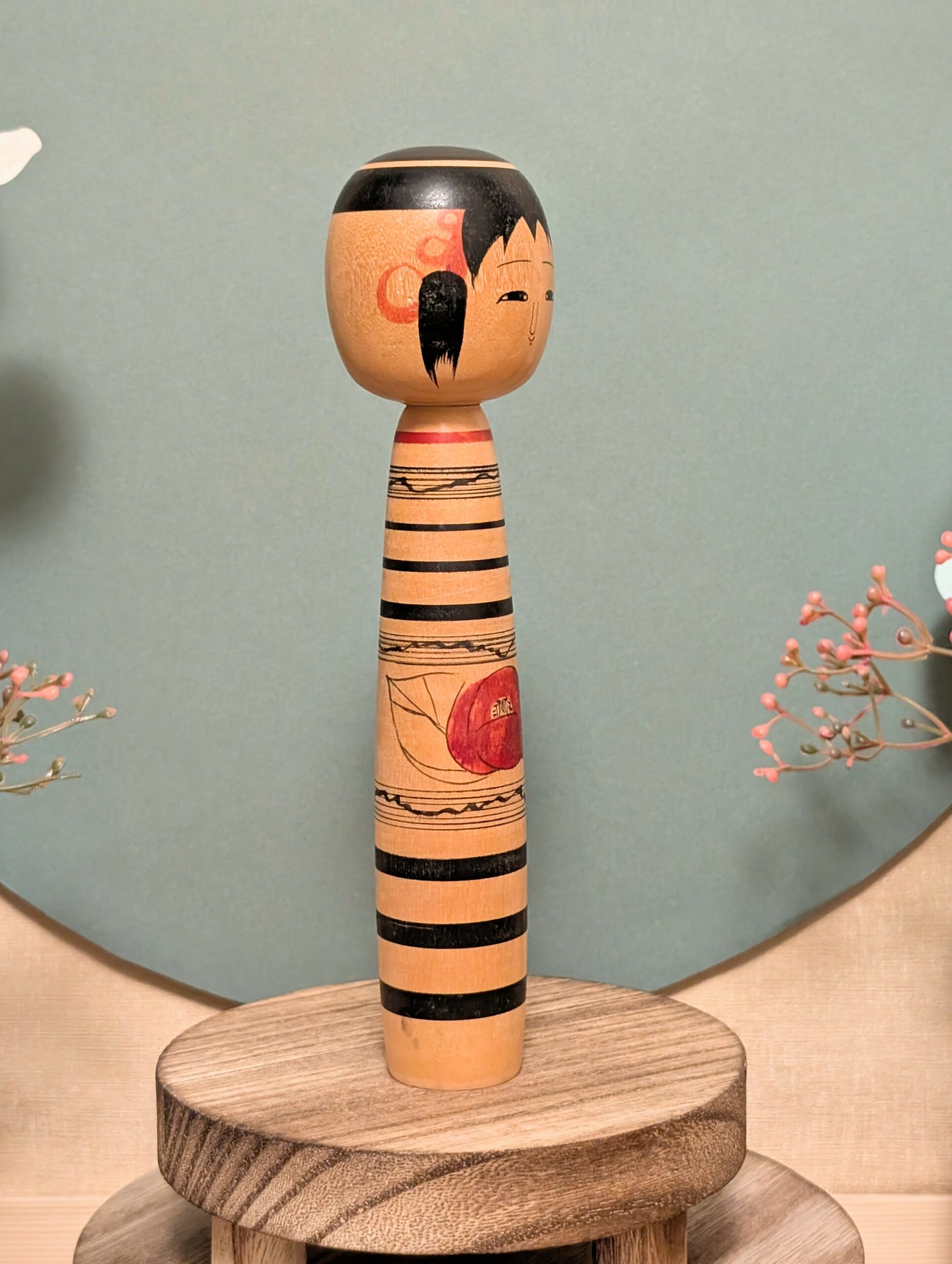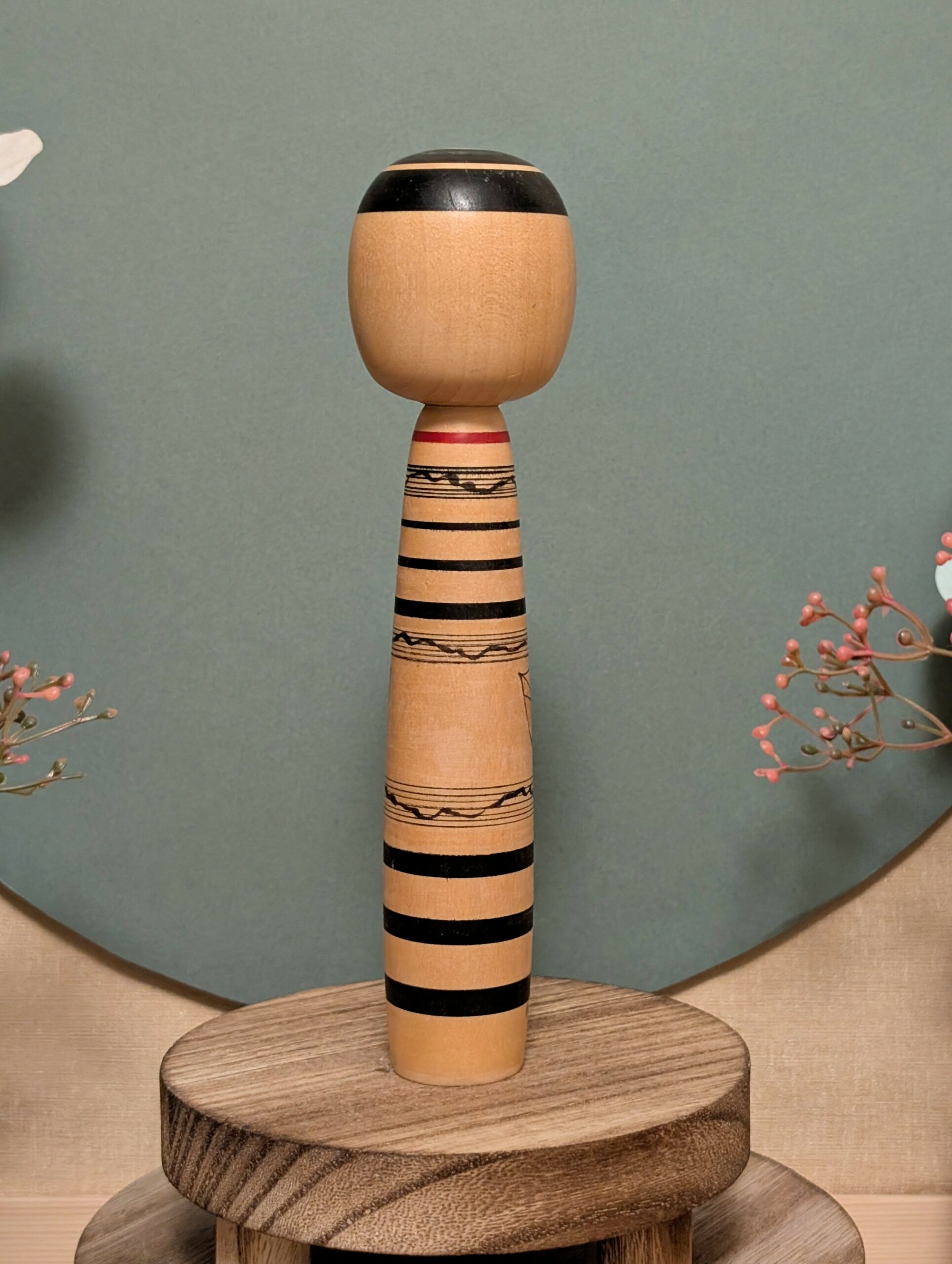 Cette kokeshi illustre parfaitement l’équilibre propre aux créations Tsuchiyu : une alliance de rigueur géométrique avec les anneaux noirs, et de vitalité grâce au motif floral coloré