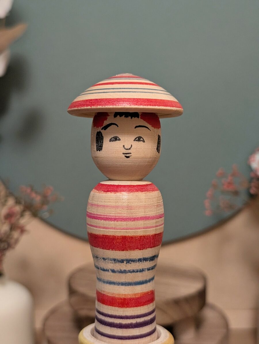 🔹 Elle porte un large chapeau conique peint de rayures qui évoque les couvre-chefs portés dans certaines régions japonaises.