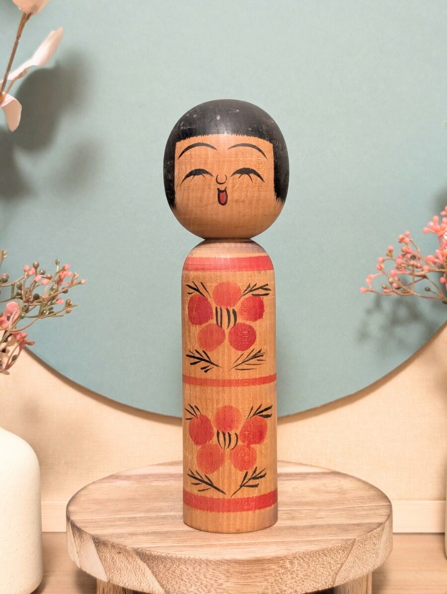 Plongez dans l’univers chaleureux du Tsugaru des années Shōwa avec cette magnifique Kokeshi signée Senzō MŌRI.