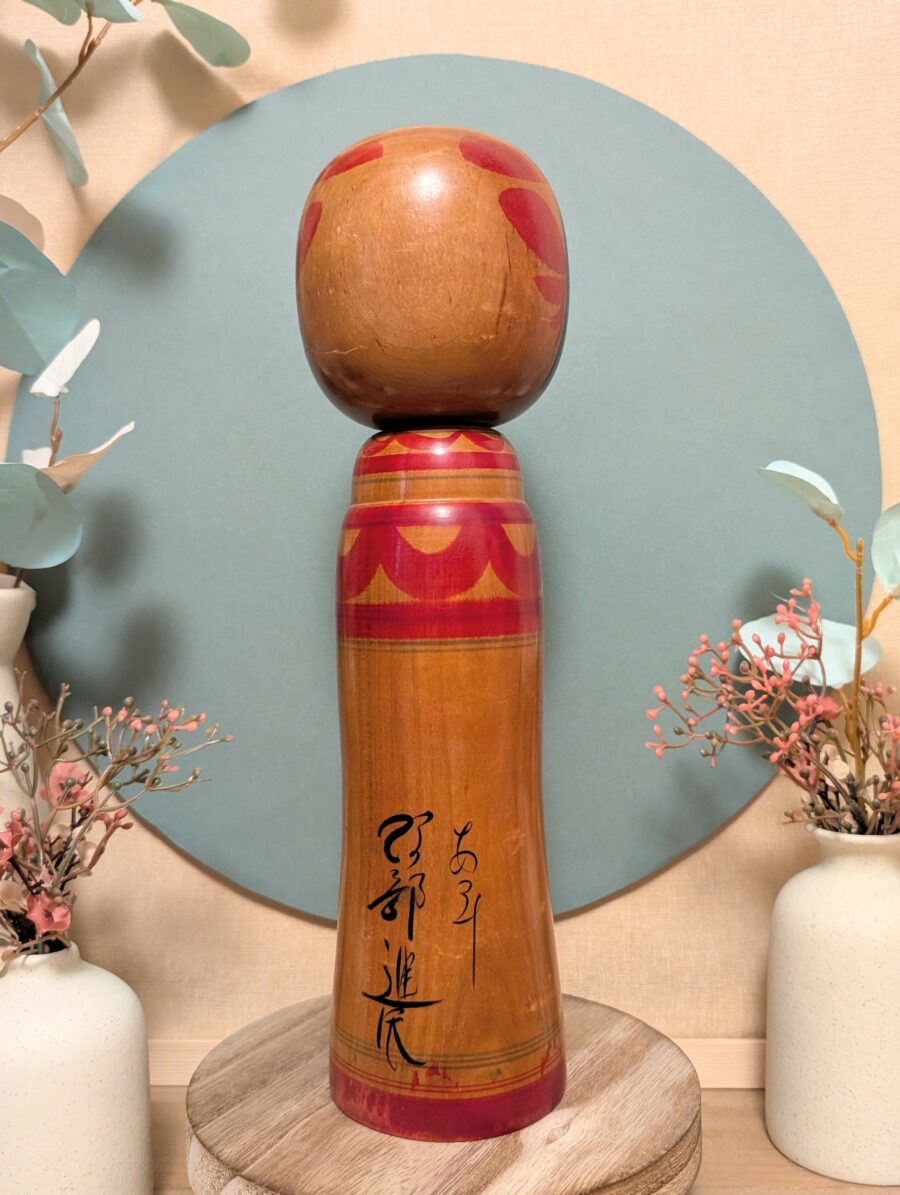 Cette Kokeshi a été réalisée par Shinya ABE, un artisan reconnu pour son travail dans le style ATSUMI. Cette kokeshi est un modèle emblématique du courant Zao Tayaku.